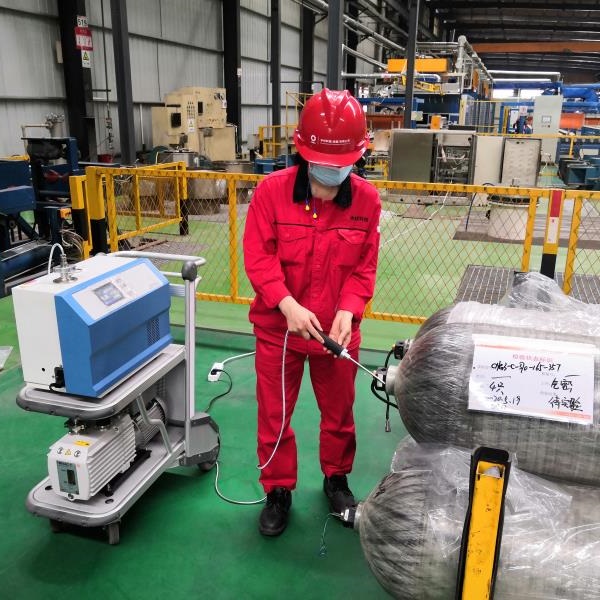 壓力容器(壓力罐)檢漏,檢漏方法采用正壓法檢漏(又稱吸槍法檢漏)是菠萝视频APP下载常用檢漏方法。吸槍通過細長管道與氦質譜檢漏儀相連,被檢件充入壓力高於環境大氣壓力的氦氣(或氦與氮混合),吸槍的吸嘴在被檢件可疑有漏孔的表麵以一定速度移動,通過漏孔漏出的氣體的一部分進入吸嘴,隨之進入檢漏儀質譜室,得出泄漏率,找到泄漏點。